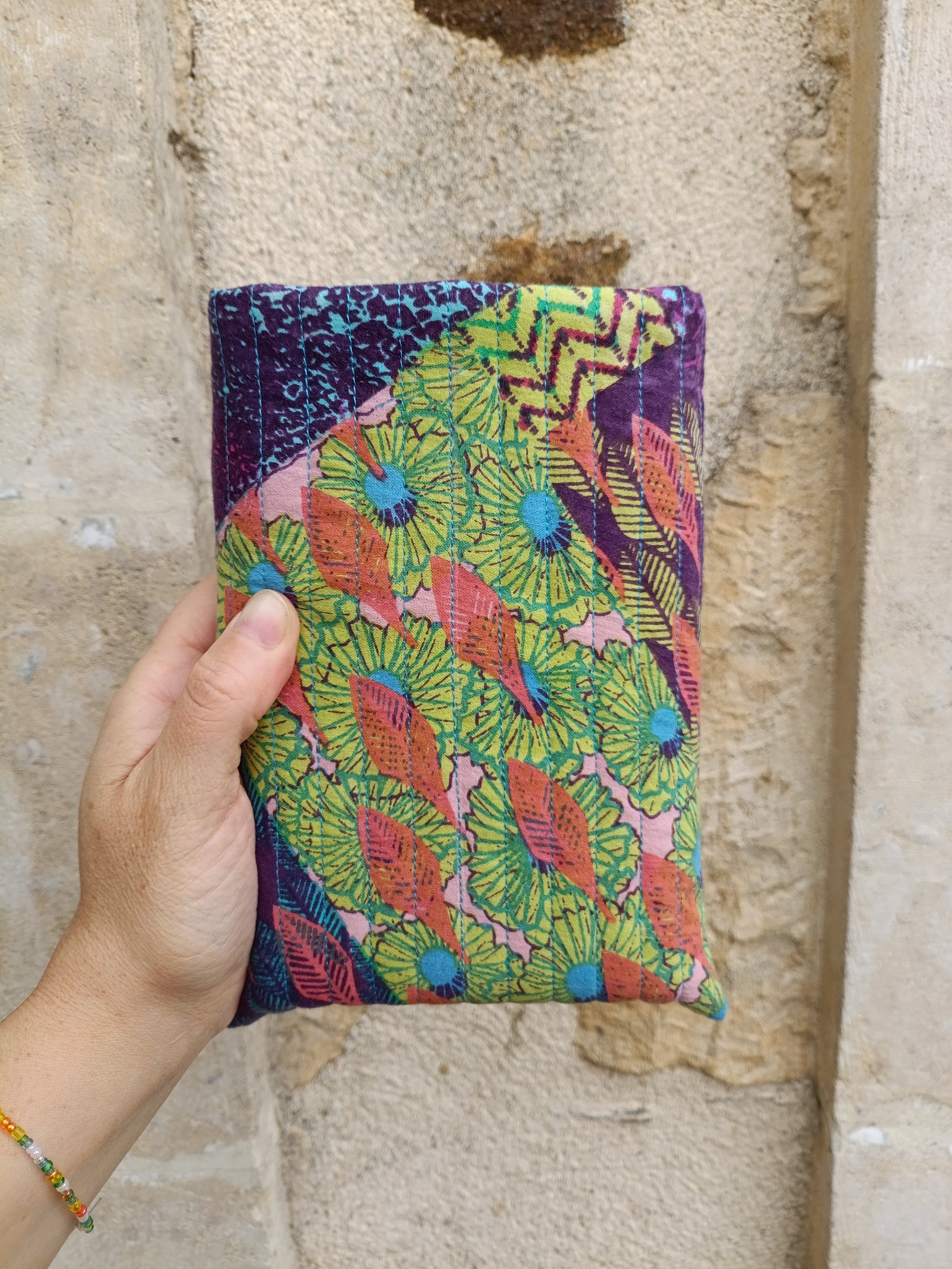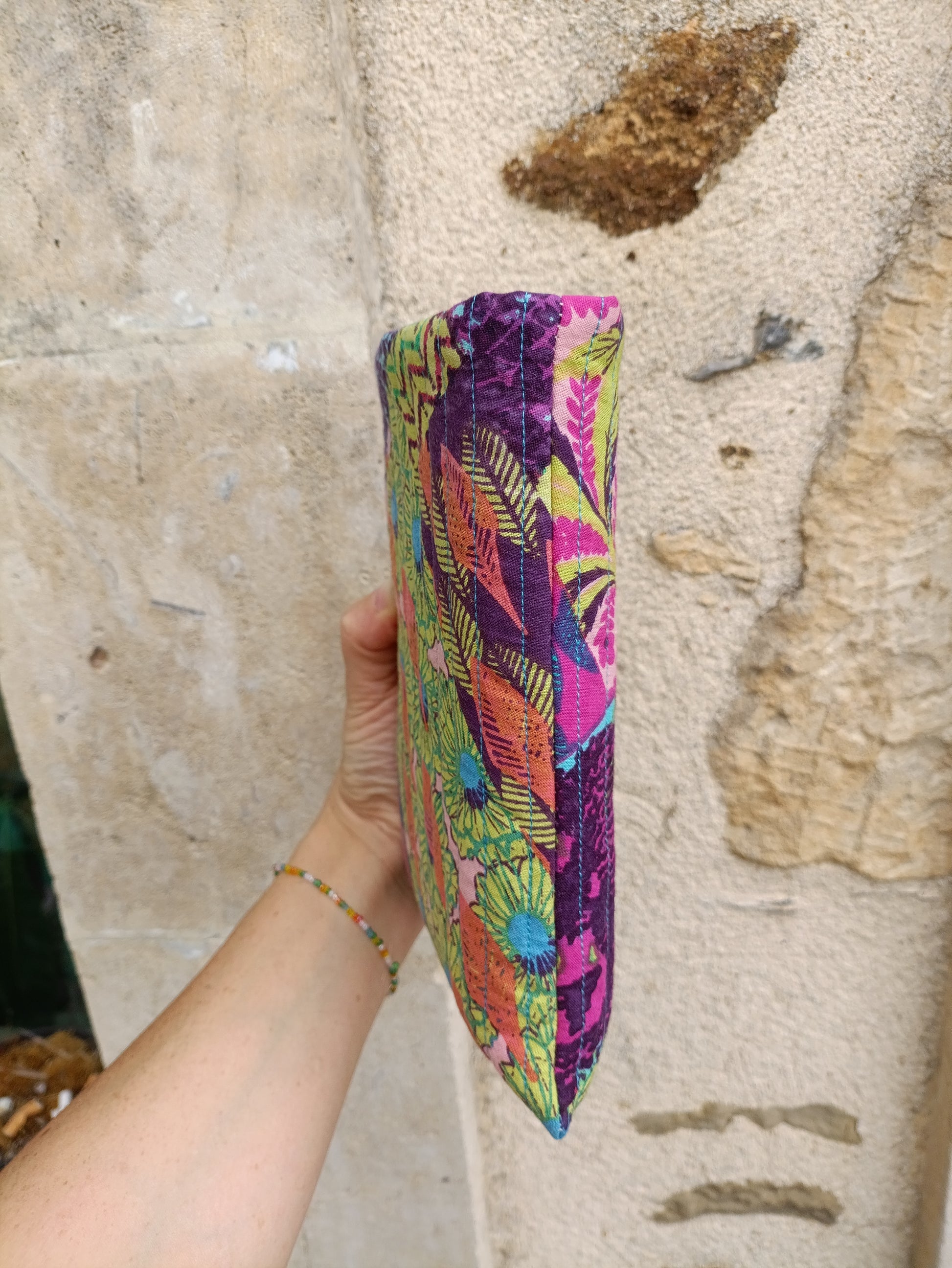 Son intérieur en coton bleu turquoise, également issu de tissus revalorisés, protège délicatement votre ouvrage tout en affirmant un style unique et responsable.